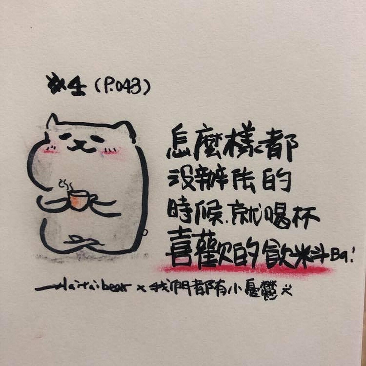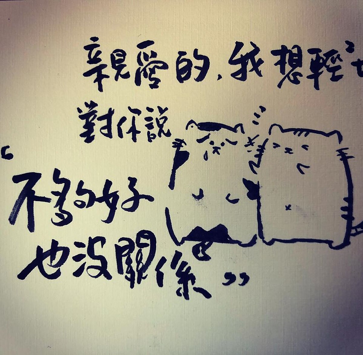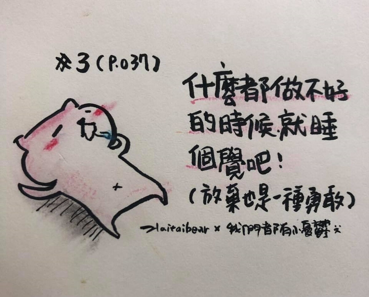 我最常講的就是沒關係。這句話很有用喔。想太多也沒關係。無法放鬆也沒關係。我發現一件事,你可以拿左手摸胸口,閉著眼睛問自己,海苔熊,你現在最想要最渴望的是什麼?停一兩妙。會冒出一句話。你就去做那件事,不要抵抗它。做到一個階段後可以再問自己一次。不要阻擋自己最真實的渴望。做不到也沒關係,有時候做到也沒關係,無法接受自己跟自己說沒關係也沒關係。