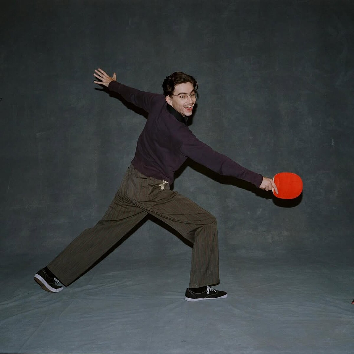 為了呼應《橫衝直闖》的1950年代設定,提摩西在拍攝宣傳照時選穿綠色針織衫內搭襯衫,搭配打褶西裝褲、灰色夾克和皮鞋,帶著復古穿搭氛圍。不過鮮明的毛衣選色提供了視覺亮點,讓整體依舊帶有現代感、活力氣息。
