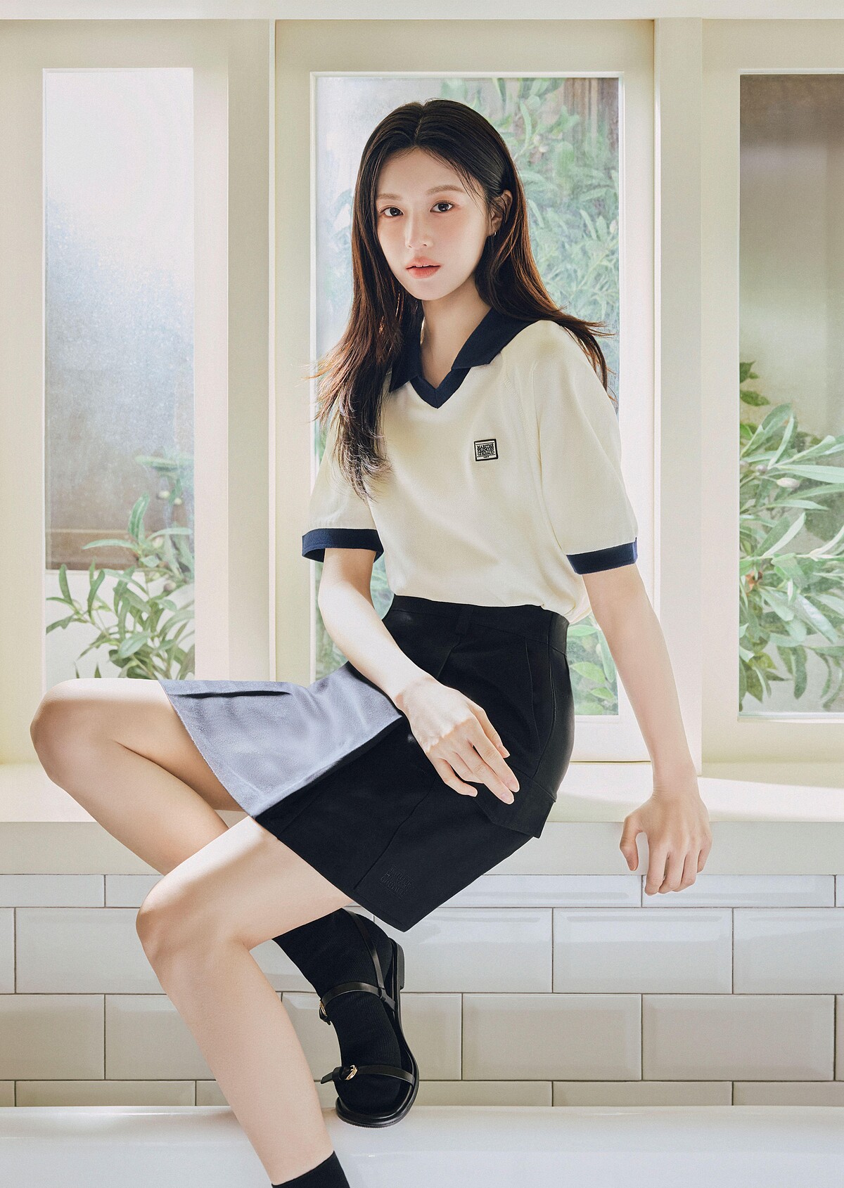 中性的Polo衫版型是男女皆能嘗試的風格,除了基本素面之外,更推薦大家可以嘗試高允貞同款條紋圓領衫,以深棕基底點綴淺藍線條,並有撞色衣領設計,替復古單品改良出現代俏皮感,再搭配上短裙,這套高允貞穿搭公式請筆記。