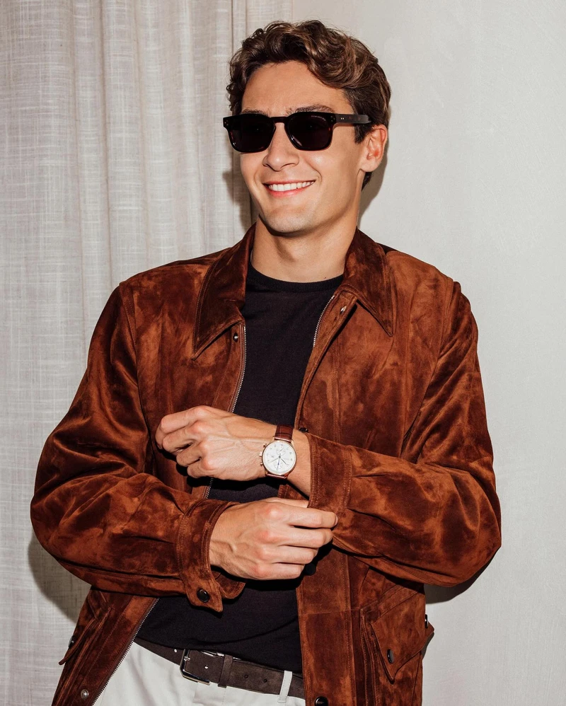 擁有姣好身材外型的賓士車隊主力車手George Russell,相較於多數車手偏好的運動或休閒風格,更常以英倫紳士風格現身,他的腕錶也偏好簡潔俐落、沉穩內斂的款式。比如在襯衫、西裝套裝中佩戴IWC工程師系列腕錶,用斯文風格中和腕錶剛毅線條;或以IWC葡萄牙系列計時錶搭配麂皮夾克,大地色系造型與玫瑰金錶殼、棕色皮革錶帶相映襯,帶來優雅魅力。
