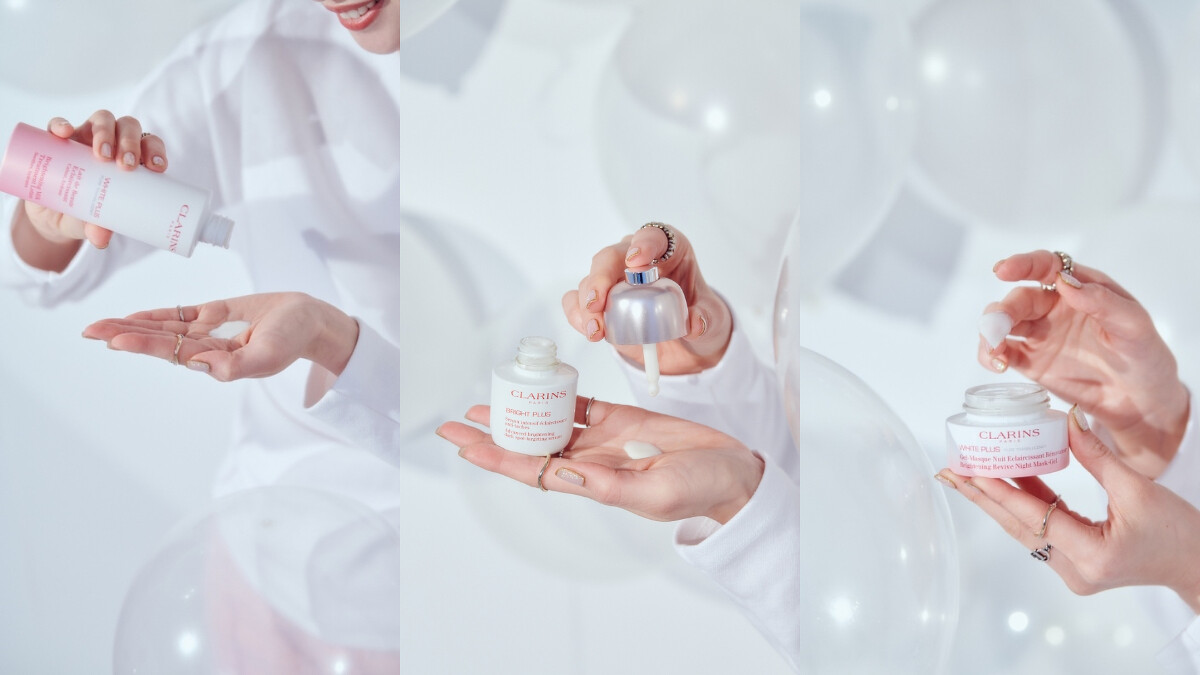 每天清潔後,第一步驟先用克蘭詩「智慧美白高機能化妝水」,長時間待在冷氣房,陳欣欣喜歡用潤澤版,好像牛奶水般的質地能讓肌膚保水通透;第二步驟也是最重要的過程,就是使用「氧氣亮白淡斑精華」替肌膚做活氧按摩,認真做,膚色膚質跟光澤度都會明顯提升!最後再用「智慧美白晚安水凝霜」,趁夜晚黃金修護期將美白精華和保濕成分緊緊鎖住,把它當晚安面膜用,厚厚地敷一層,隔天醒來肌膚更加充滿光澤。