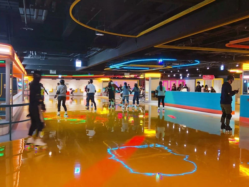 占地400坪,滑冰主場地約220坪,提供四輪滑輪鞋租借,鞋子尺碼範圍為34~45,對照是22公分~29公分,身高須滿140公分才能進場。最吸睛的是,滑輪還會「發光」,每個人溜起冰來都帥氣滿分、架勢十足!能容納150人同時溜冰,歡迎揪團來挑戰「接龍」長度。
