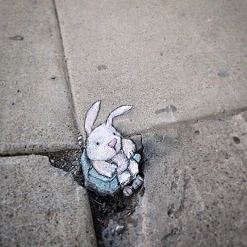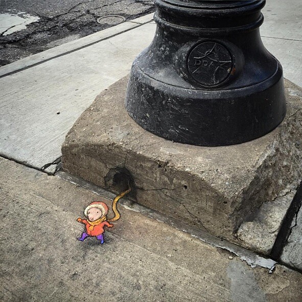 還記得小時候家裡有個繪本叫「阿羅有隻彩色筆」,拿著神奇彩色筆的小小孩阿羅,沿著牆角畫了一扇門,門就變成真的,阿羅推開門走入精彩的探險中。長大以後,越發羨慕那些擁有「神奇彩色筆」能力的人,總能在每個人都靠左靠右走的平凡世界,輕輕一揮筆便勾勒出能上天入地的路。就像 David Zinn 的街頭粉筆藝術,讓每個人人匆匆走過、從不會費心多撇一眼的街角路邊,成為小怪物的游泳池、飛天小豬和小老鼠喝下午茶的地方。從此這些殘缺破損,陽光無法灑落的的角落,成為人們眼底最柔軟的存在。