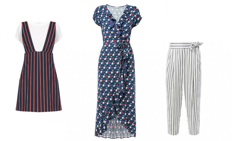 (由左至右)學院條紋兩件式背心洋裝NT15300/法式塗鴉圍裹式荷葉洋裝NT16900/光澤感條紋綁帶老爺褲NT13600