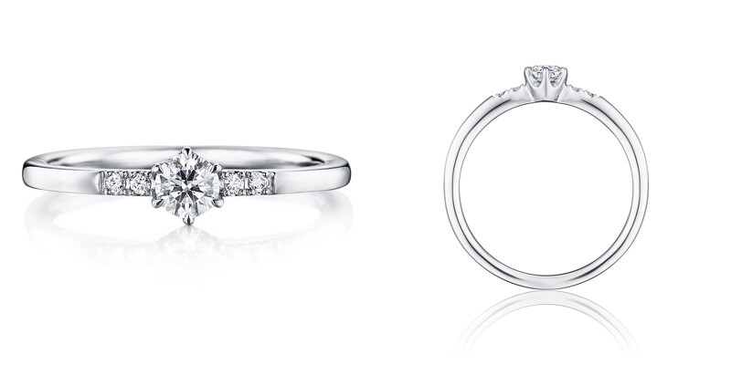 採取在主鑽旁以戒環延伸環抱碎鑽的設計,洋溢著女性柔美氣質,環抱碎鑽的戒環則以一種俐落勾勒卻又異常美麗的圓弧造型呈現。