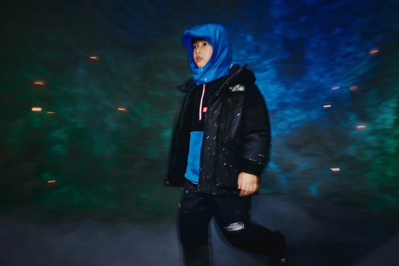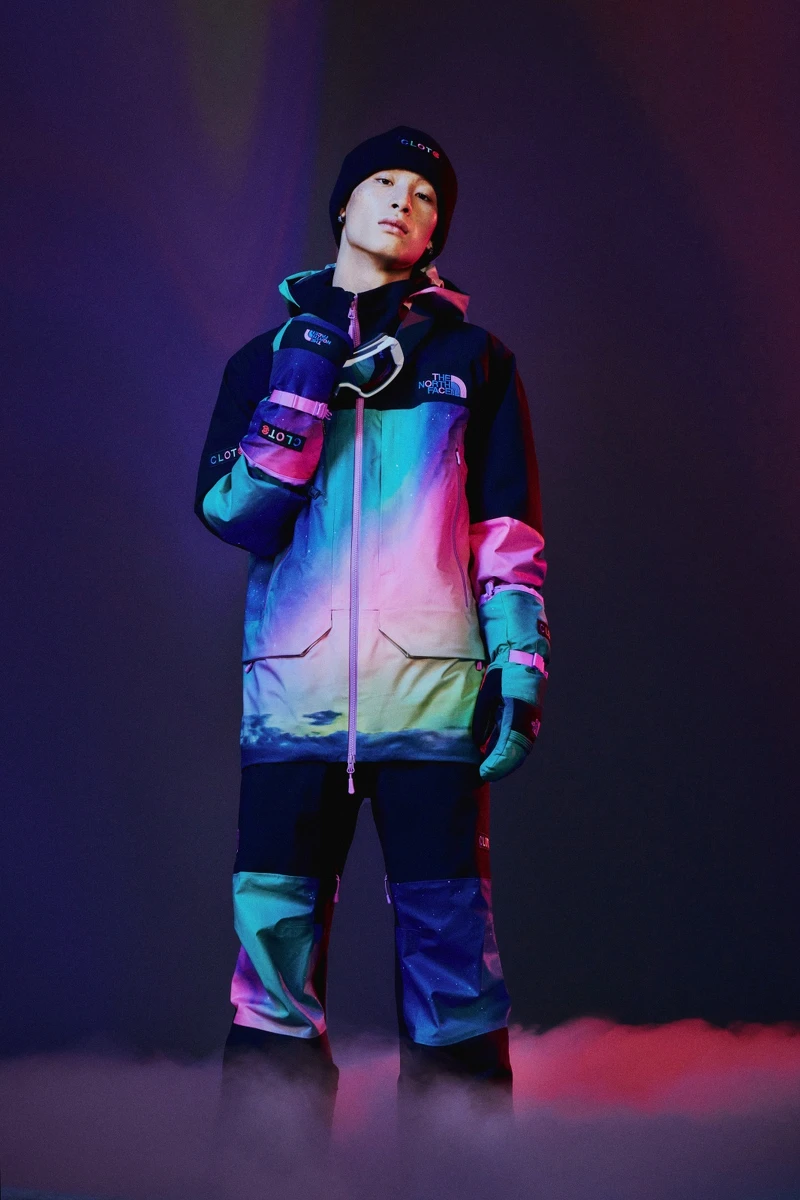 The North Face x CLOT聯名系列第二篇章命名為「極夜未眠」,將大家的視線拉到了北極區,夜幕降臨後高空中跳躍的極光,星際藍、極光綠、霓光虹、星雲粉等神秘色彩,被擷取到了全新系列的服裝設計中。
