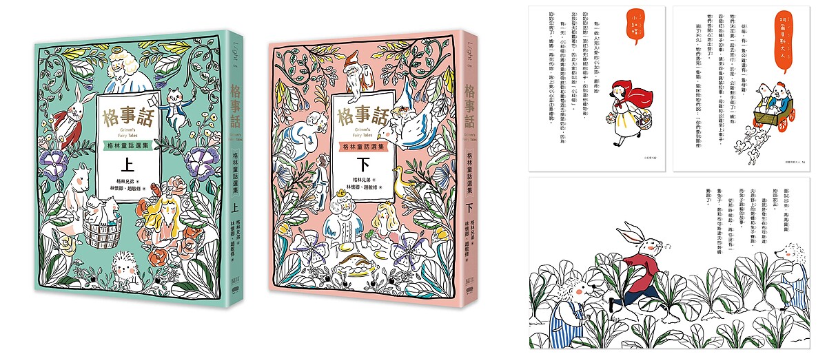 《格事話-另一種格林童話》內頁則邀請到插畫家 Dinner Illustration 繪出能帶領孩童們在無限想像的童話世界裡彩繪,而以簡單的線稿與顏色搭配之下,而可在閱讀的同時延伸出更多的想像力,並且還能自己親手動筆替插畫上色,感受閱讀之餘的多元感官體驗。
