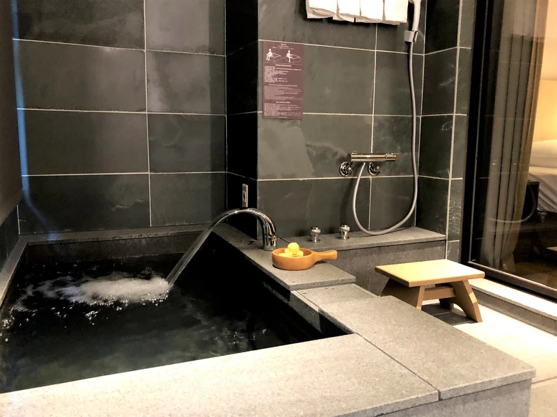 而到了冬天每間客房都規劃有超大溫泉池,提供沒有任何顏色味道的碳酸氫鈉泉放鬆,
