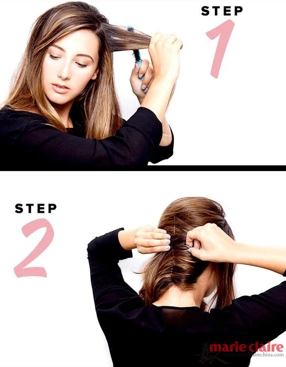 Step 3.前邊留出一部分的頭髮,將剩下的頭髮在腦後順著吹風方向挽起來,然後固定好。