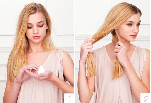 先在髮中段到髮尾處均勻抹上造型泡沫增加完成髮型穩定性,再將全部頭髮梳攏到同一側後分成兩束,利用像將繩子打結的方式將兩束頭髮打一個結,重複打多個結後,用小黑夾固定就完成。