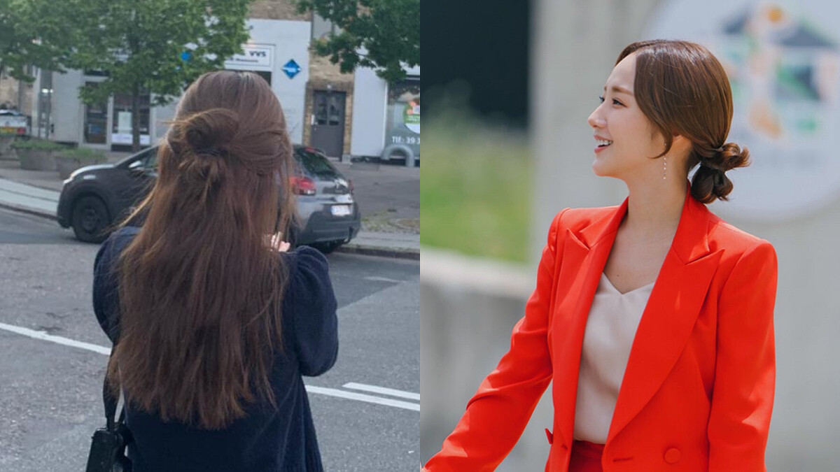 但秀智綁的可不是常見的一個圓髮髻,仔細一看,和朴敏英在《她的私生活》出現的「雙折包包頭」有異曲同工之妙!