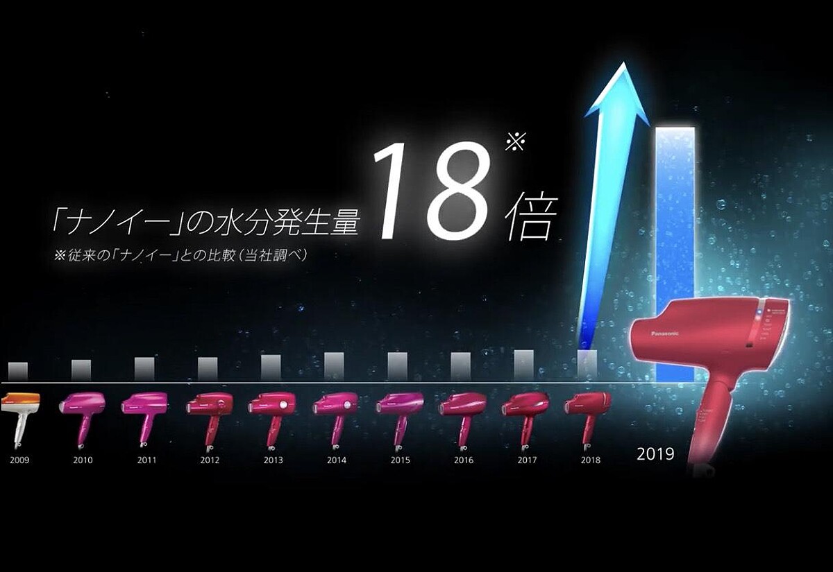 從2005年推出首款奈米水離子吹風機開始,直到2016年為止Panasonic一共在吹風機中升級了三次奈米水離子產生量,今年9月即將發售的Panasonic EH-NA0B更是一口氣將奈米水離子產生量提升了18倍(與2016年上市NA98相比),是史上奈米水離子含量最高。