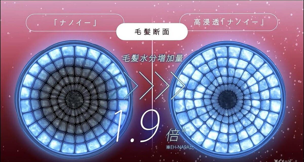 當奈米水離子產生量提升到18倍,這些奈米水離子能進入多少到頭髮內,發揮護髮的功能才是關鍵!這次滲透性更高的奈米水離子,不僅僅只在頭髮表面形成濕潤度,還進入到毛鱗片中水份補充到髮幹中,對於頭髮保濕水分子滲透提升了1.9倍。