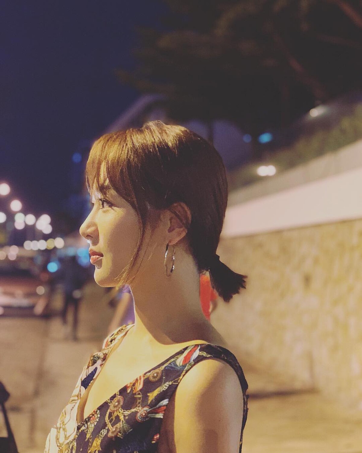 短髮綁起低馬尾相當有個性,增加了成熟的韻味,耳側兩旁拉出一些碎髮修飾臉型,夏天清爽涼感又時尚。