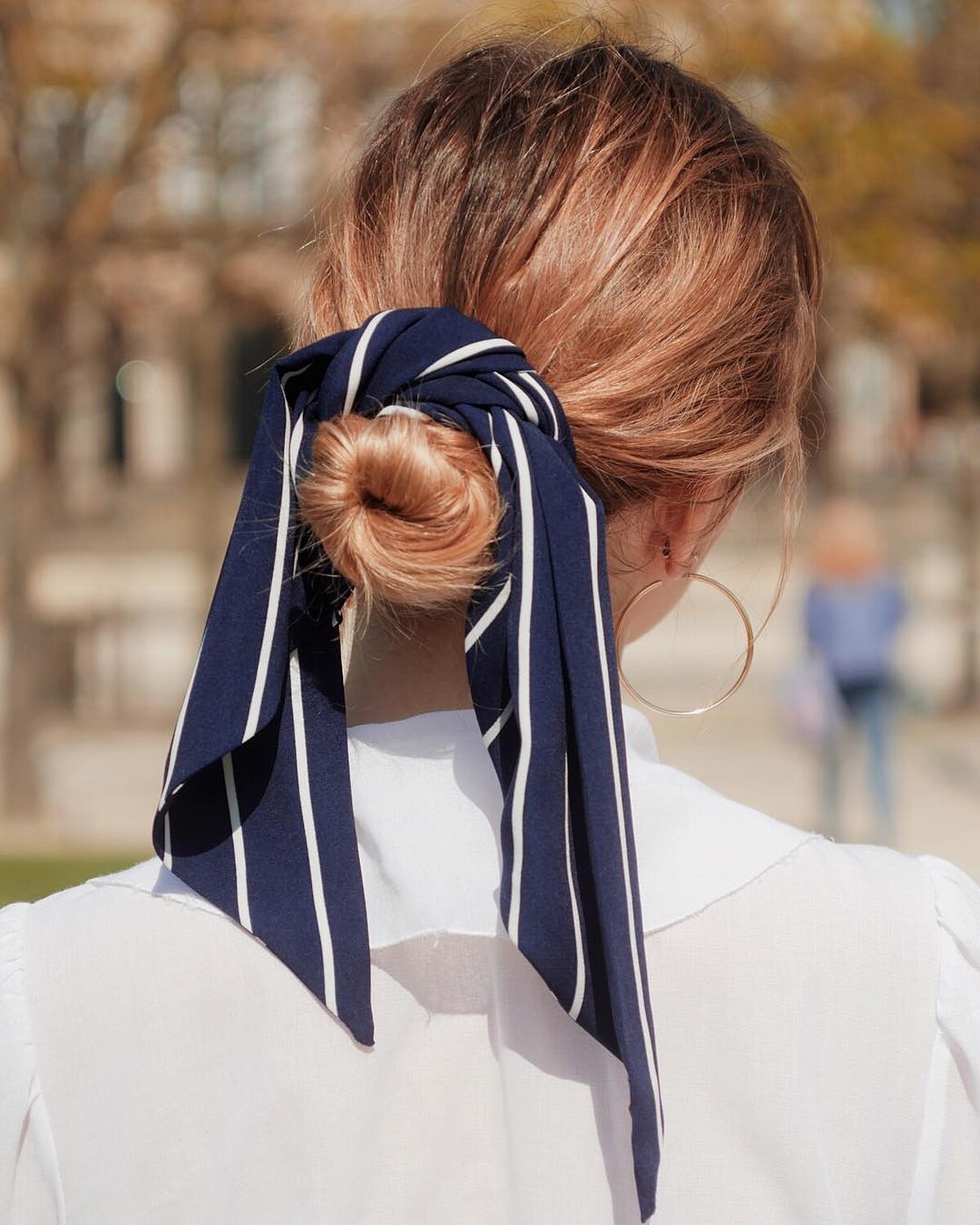 今年還特別流行使用長長的絲巾去綁頭髮,絲巾長度會較長,與頭髮長度相約,時尚感十足。