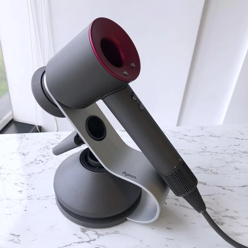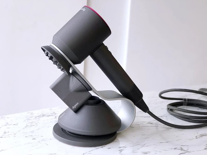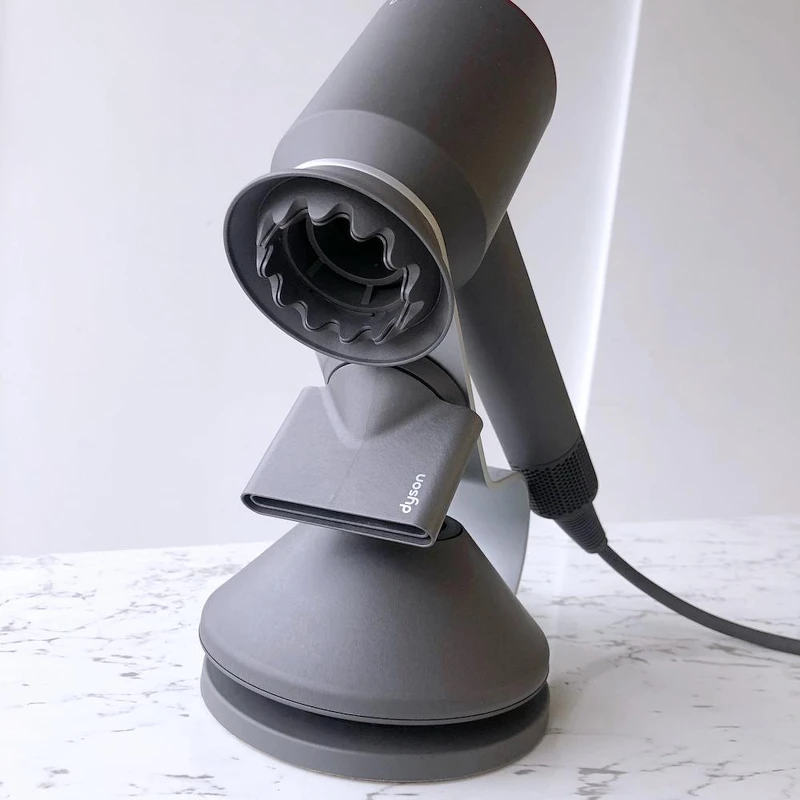 專用底座為簡潔流線造型,質感又時髦,可以一次吸附兩款吹嘴、放置吹風機機身和一個烘罩。