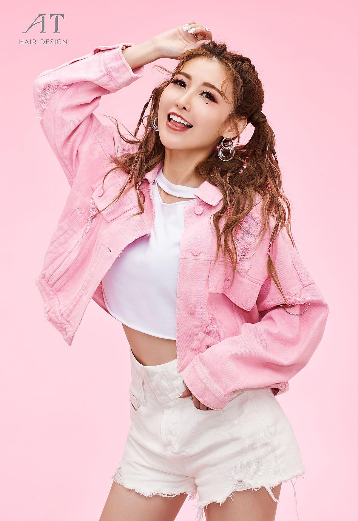 看看愷樂這粉嫩嫩的元氣造型,搭配上中分的空氣微捲瀏海、編綁雙馬尾、鬆散自然感捲髮的組合,瞬間就秒變身成為俏麗韓妞女團Style了。