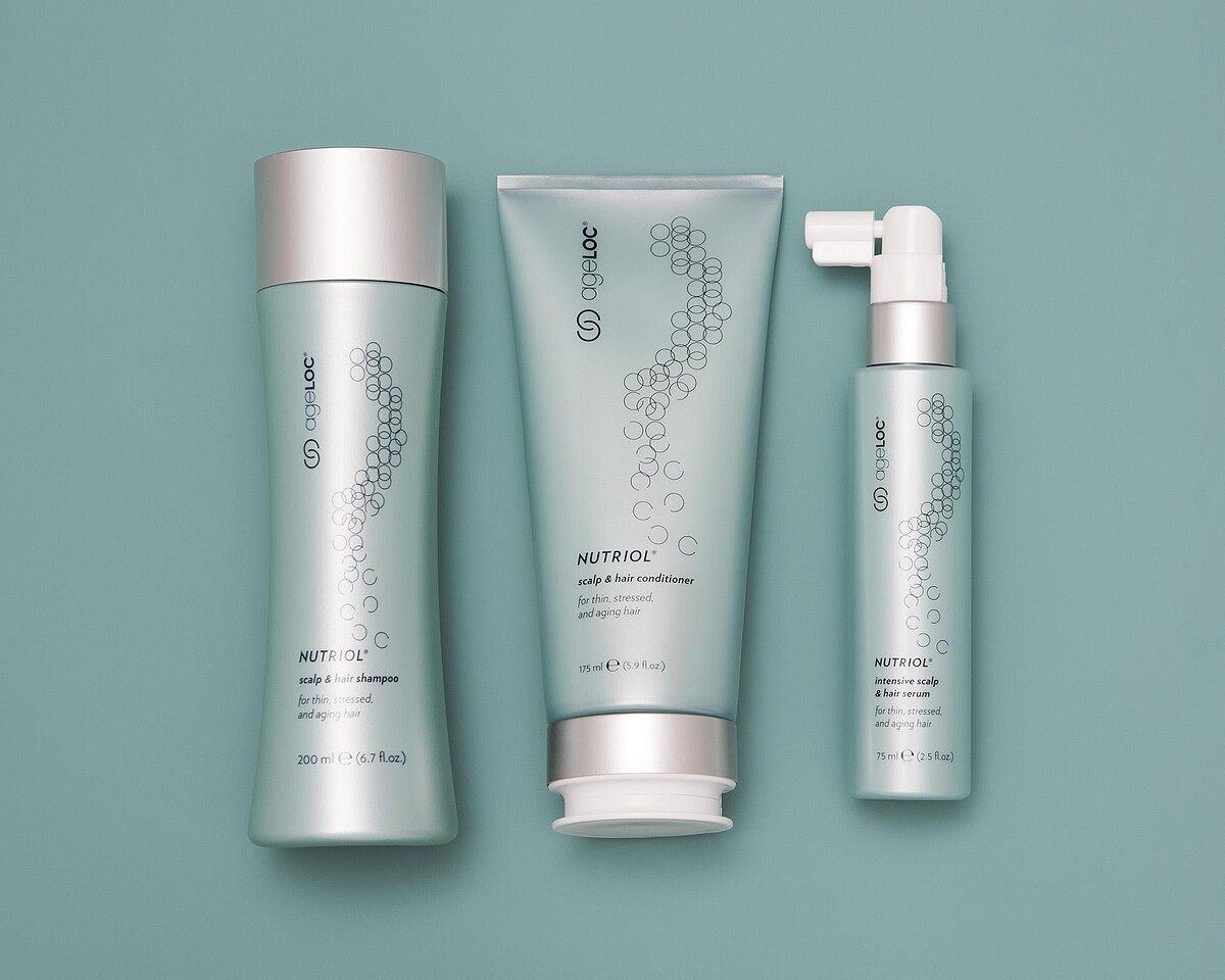NU SKIN 也針對現代人的頭皮、髮絲困擾推出了ageLOC® Nutriol® 賦活精萃豐盈系列,結合直擊頭皮及頭髮問題根源的ageLOC®配方,以「滋潤、營養、修護」的頭髮營養成份,包含紅花苜蓿萃取、甘草萃取、多胜肽與煥活養髮複合蛋白等,提供頭皮和頭髮所需的重要營養,更能夠針對扁塌、斷髮問題進行改善。
