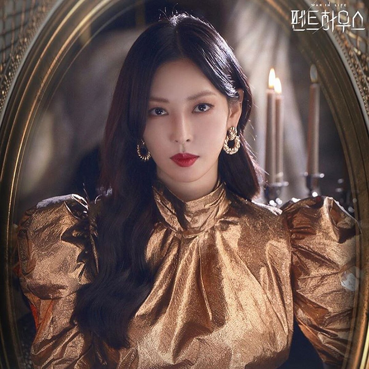 在劇中角色性格非常強烈的她,不僅妝容使用的顏色較為深黯、飽和,髮色也是完全的黑髮,配上明顯的中捲波浪,整個人散發出的氣場非常銳利,頭髮披散時,會將左邊的頭髮塞到耳後、撥到肩後,這樣的造型如果需要大動作非常容易就會亂掉,也可以因此得知金素妍在劇中是同時要hold住氣場,但又要維持優雅的狀態的!