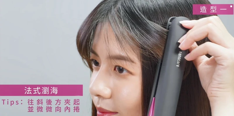 將側邊的瀏海從髮尾處夾起上往斜45度捲半圈到一圈(可視瀏海長度自行決定), 停留5秒後快速放下,記得只要捲髮尾就好,髮根處不要捲起,就能有日系雜誌那種氣質長劉海。