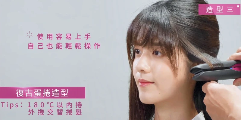 將Panasonic奈米水離子直髮捲燙以垂直90度的角度,分小段小段將頭髮向外捲,就能完成現在IG上最流行的蛋捲髮型。