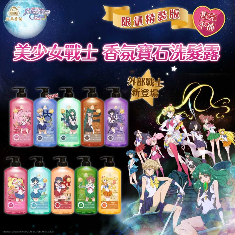 「香氛寶石洗髮露 精裝限定版」將原有的五款經典戰士,以滿版的姿態全新問世,更添完美風采;此外,五款超人氣外部戰士,包括土星、天王星、海王星、冥王星、小月亮,也同步強勢推出,從角色本身魅力,到華麗瓶身、持久香氛,再次全面擄獲美戰迷的心!每款香氛寶石戰士,都擁有其專屬代表色,及精品香水香調;香氛全數出自國際調香大師精心調配,採六道香氛淬鍊工序,打造香水般的前、中、後味,持香度與角色人氣一樣,小編已經少女心大噴發~小孩子才做選擇,我全都包啦!