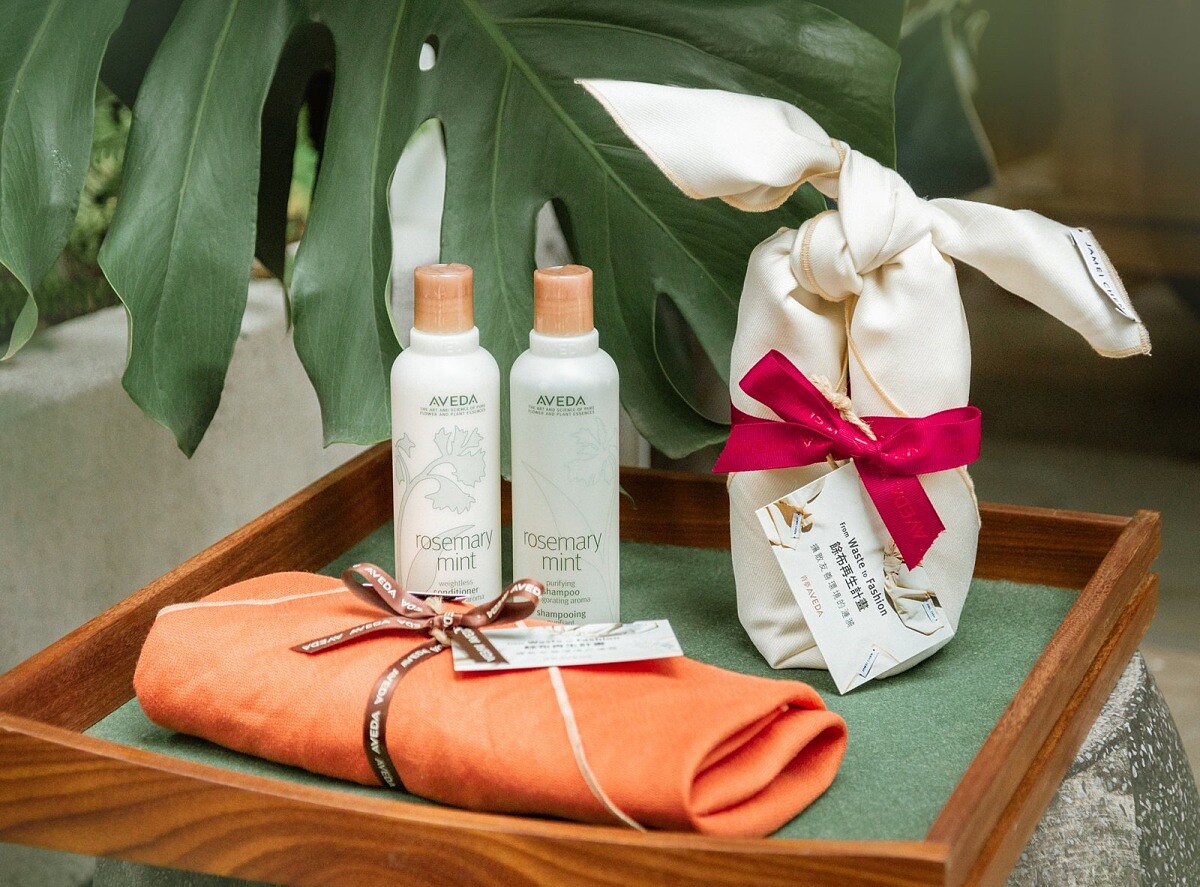 Aveda與臺灣時裝設計品牌JAMEI CHEN合作,秉持著不浪費資源的理念,將生產線剩餘的精美布料改造成可多元使用的生活萬用巾,可變化成多種包裝形式取代紙盒,更可作為披巾、餐墊、桌巾等用途,在日常生活中被重複使用。