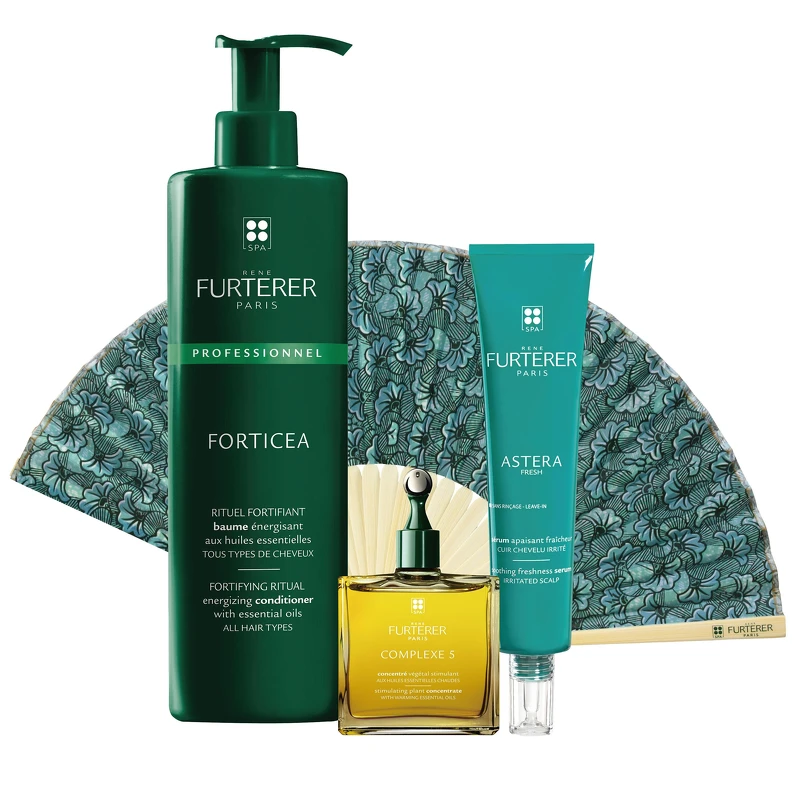 內容:RF頭皮養護5號精油or ASTERA紫苑草頭皮舒緩精油 50ml (2擇1)+FORTICEA複方精油煥能修護膜600ml+ASTERA紫苑草頭皮舒緩凝露75ml+RF印花涼夏竹扇 (限量)