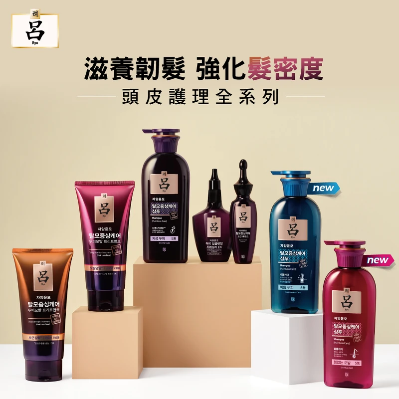 被暱稱為紫瓶的滋養系列,主打含有高濃度人蔘全草精華及咖啡因成份,能夠洗去頭皮的髒污與多餘油脂外,蘊含的韓方成分也能為頭皮及髮根補充營養、進行根本養護,無論在韓國或台灣都是開架熱銷的洗護系列,今年針對消費者常見頭皮問題:髮根扁塌、出油、頭皮屑,推出兩款新的洗髮精:扁塌無力髮專用、去屑專用洗髮精。
