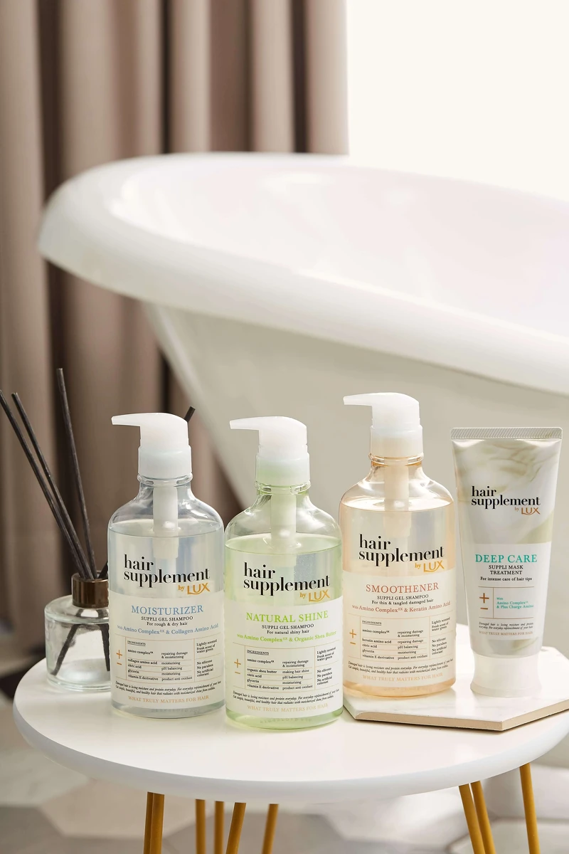 髮の補給機能飲主打對症下藥,分別替不同問題的髮絲提供養份,去年在台上市兩個系列,獲得銷售超越41座東京鐵塔高度的佳績,分別是粉金色瓶身、細軟髮適用的角蛋白胺基酸洗護髮,主打蓬鬆、柔順;和藍色瓶身、受損髮適用的膠原蛋白胺基酸洗護髮,主打保濕和修護,今年則全新上市綠色瓶身乳木果萃取胺基酸洗護髮,主打修護換季容易斷裂的髮絲。