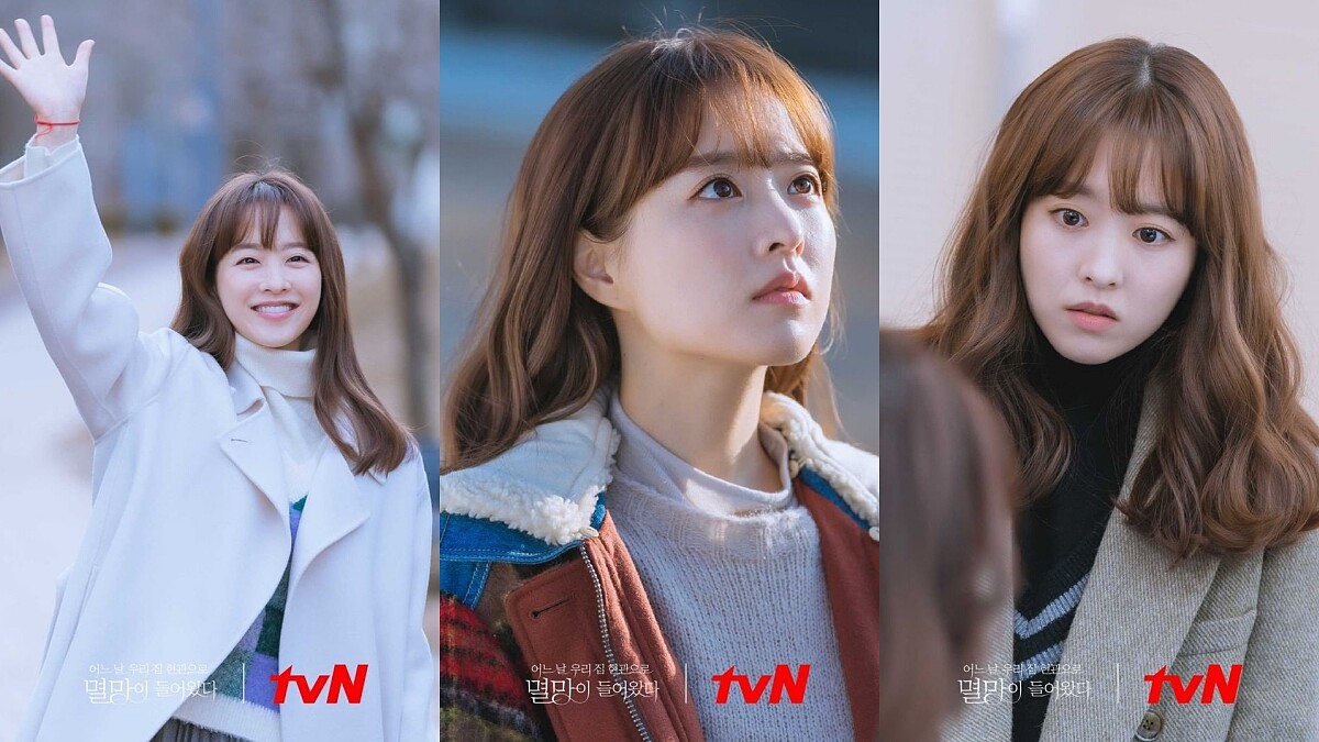 由徐仁國、朴寶英主演的燒腦奇幻愛情劇《某一天滅亡來到我家門前》,朴寶英擁有「超強童顏」的稱號,在劇中飾演網路小說編輯卓東景,先不提劇情在第一集她就有夠倒霉,身為OL的她在劇中以棕髮色、大波紋微捲搭配時而變成八字的氧氣瀏海,穿搭造型也是低調卻知性,非常符合在社會闖蕩一陣子的模樣。