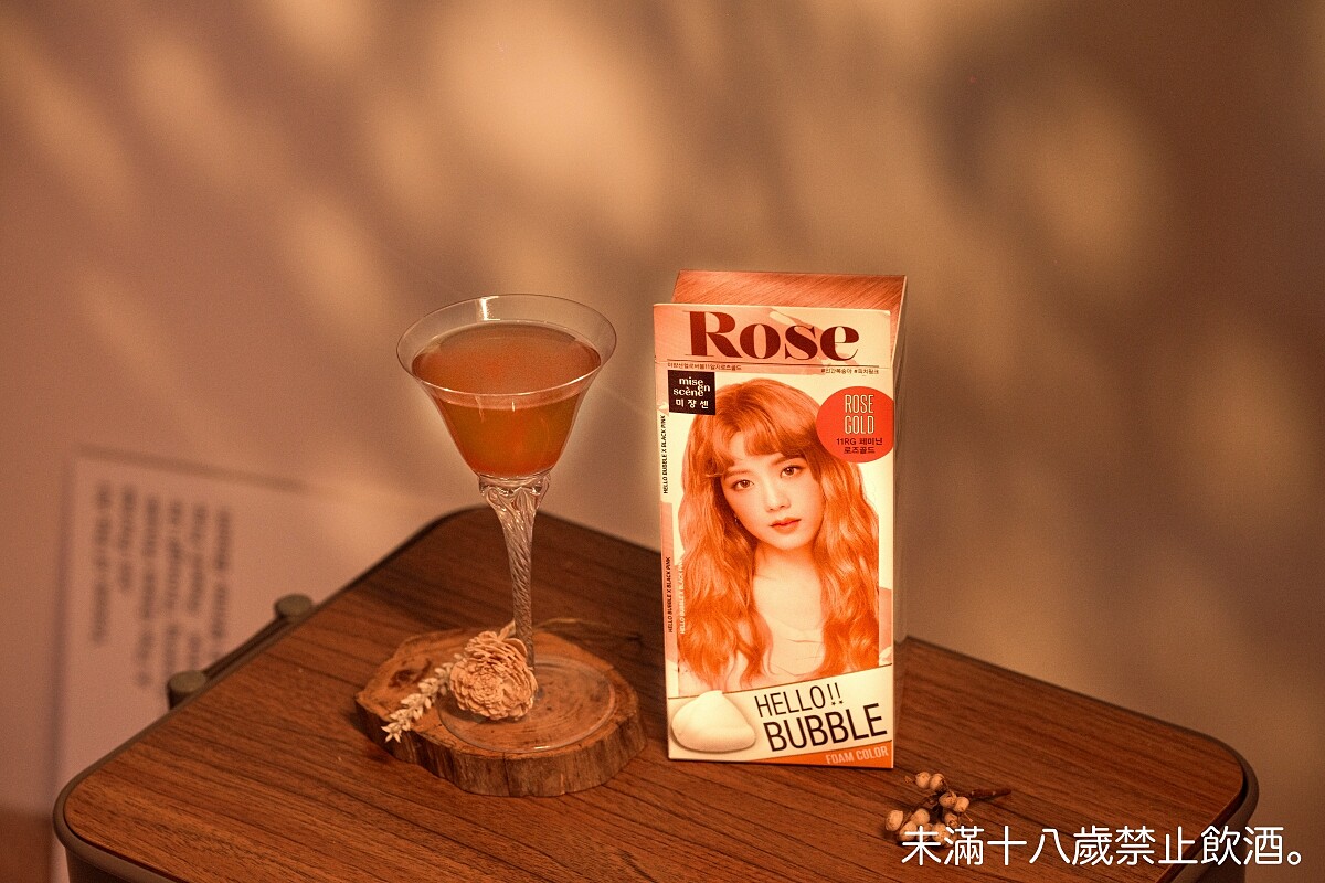 帶點復古色調的玫瑰金,是今夏韓國的熱門髮色。酒款設計上選擇以大馬士革玫瑰浸泡的premium燒酒搭配萊姆酒,尾韻帶點微辣的薑糖味,甜美中不失個性,展現復古少女的俏皮可愛。