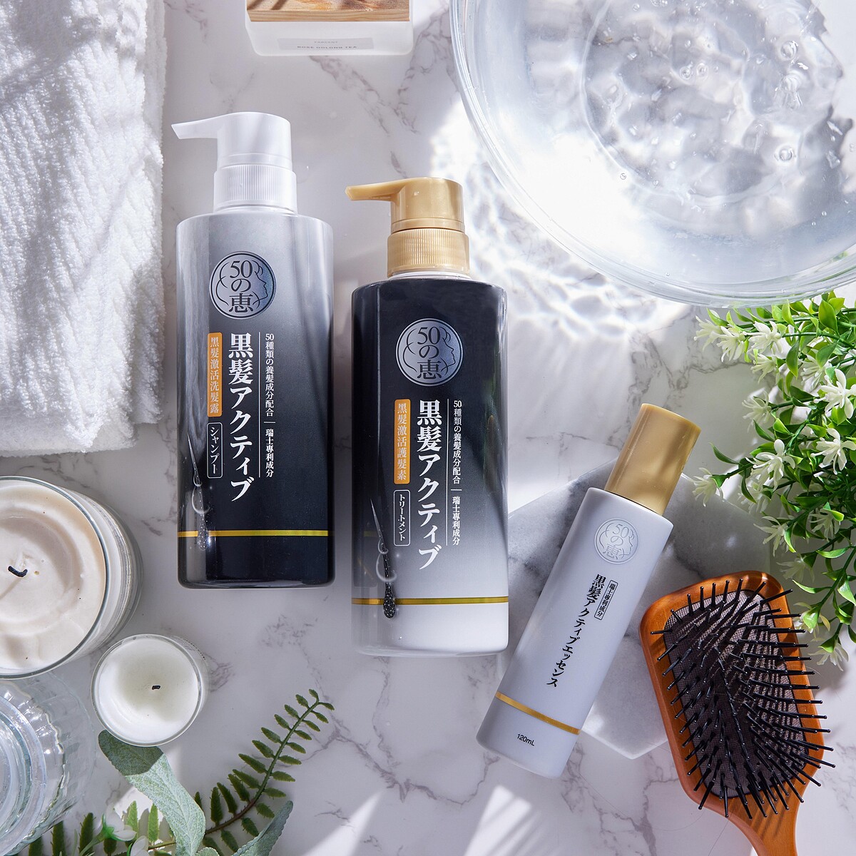 除了認真使用「50惠黑髮激活精華」之外,如果可以從清潔就開始打造健康頭皮,那當然就更完美了!專為頭皮頭髮老化問題所設計,「50惠黑髮激活洗髮露、護髮乳」除了一樣擁有瑞士專利黑髮活化因子Darkenyl™之外,還添加了何首烏、黑芝麻、人參、海藻等50種精華,溫和清潔的同時還能促進頭皮循環,直達髮根提供滋養,不只為頭髮打造健康生長環境,還能深入修護自然原生髮色,重現年輕烏黑秀髮!