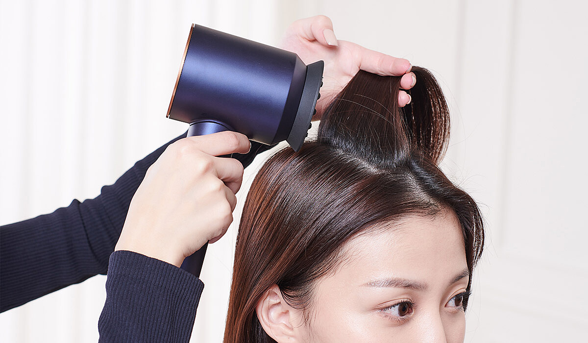 Step1:使用「柔和乾髮吹嘴」貼近頭髮將根部吹蓬,加熱後冷卻停留3秒,降低20%的溫度,溫和不傷頭皮還能幫助髮根蓬鬆定型,撐一整天不塌扁。