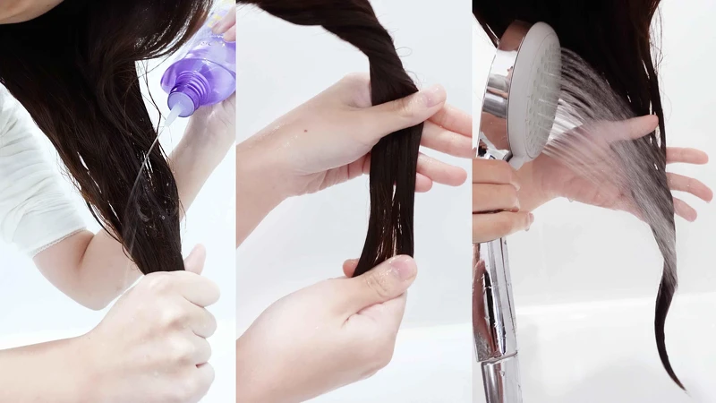 2按:塗抹髮絲中段~髮尾,輕輕按摩髮絲。