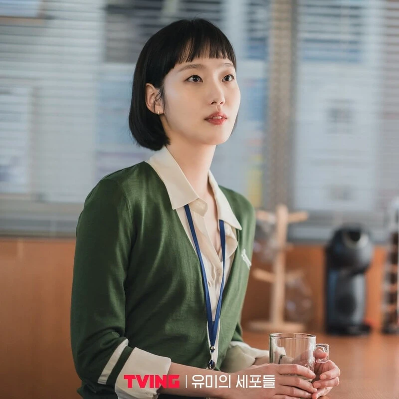 金高銀在《柔美的細胞小將》劇中的短髮造型也相當減齡,無層次的短髮會有一定的厚度,長度落在下巴左右,髮尾呈現簡單的內彎造型,整個人有種未經修飾的天然感,相當自然,加上原生的深髮色,也讓金高銀帶有些許復古學生的氣息。