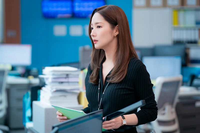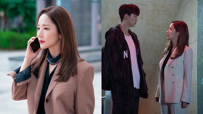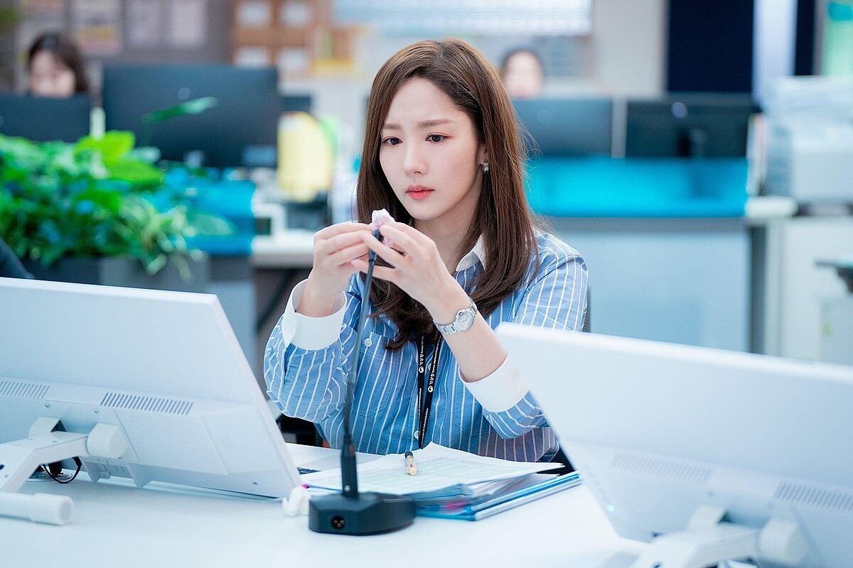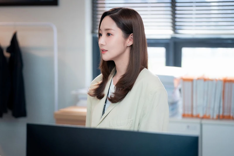 中短髮是韓劇中亮相頻率很高的一款髮型,像是《那年夏天》中金多美也是類似的髮型,不同的是朴敏英的髮尾層次沒有那麼虛,整體看起來還是比較豐厚的髮量,有光澤的茶棕髮色配上大旁分,整體來說幹練又優雅。