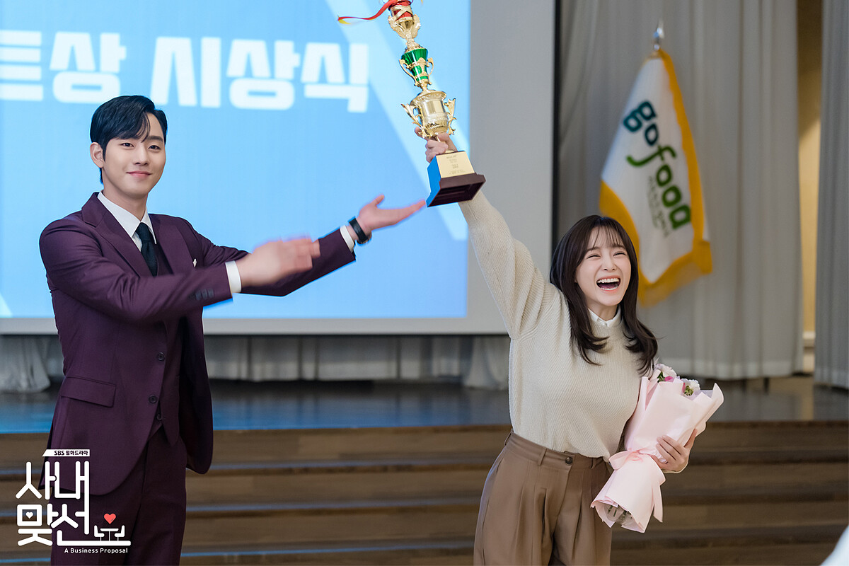 劇中意外和社長相親,為了怕被解僱隱瞞真實身份,換了造型、妝髮,整個人和上班族申夏莉形成反差,除了加重妝容外,旁分上大波浪過胸長髮也讓造型更加成熟,而讓造型更華麗、搶眼的一大重點就是在內側明顯的金髮挑染。