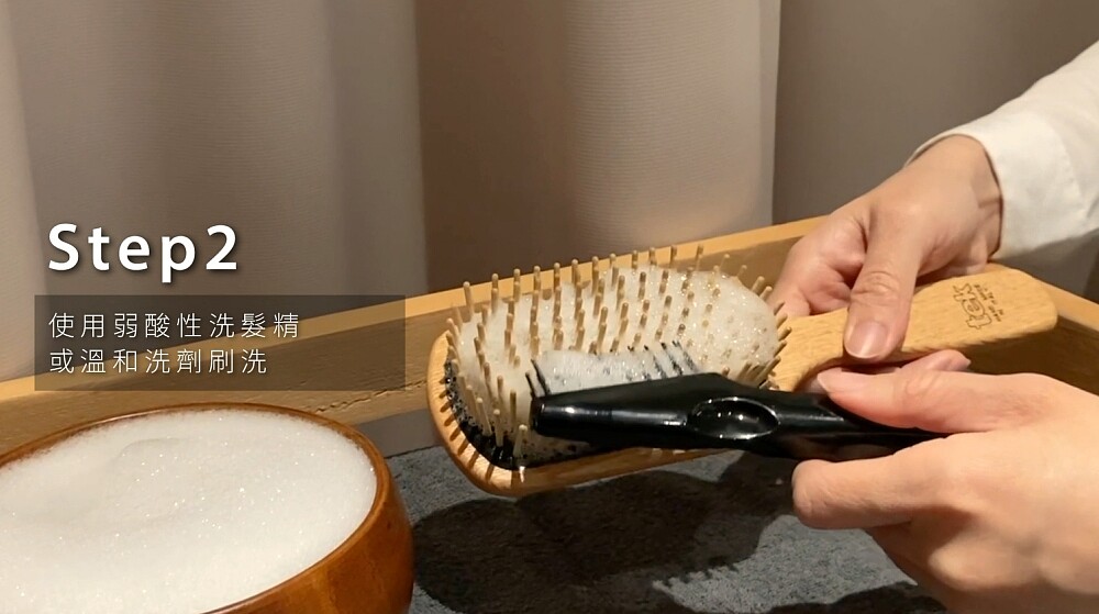酸性溶液擁有良好溫和地去油汙效果,因此透過適量弱酸性的洗髮精並加入少量的水分,可讓洗髮精產生細緻的泡沫,再均勻塗抹於梳具表面並輕搓梳版與梳柄,可讓泡沫吸附油脂與髒汙。