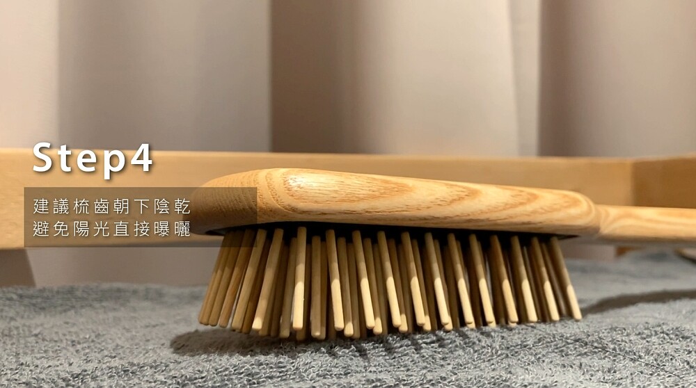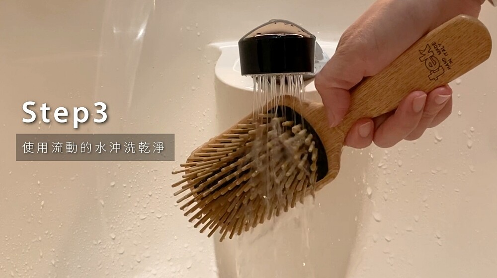 為了防止洗髮精的殘留,並讓梳具維持乾燥,完成沖洗後可以輕輕甩乾或使用乾布吸取表面多餘的水分,並將梳齒朝下擺放使水分透過氣孔中流出,才能避免梳具因潮濕而產生黴菌或變質,反而對頭皮造成更大傷害。