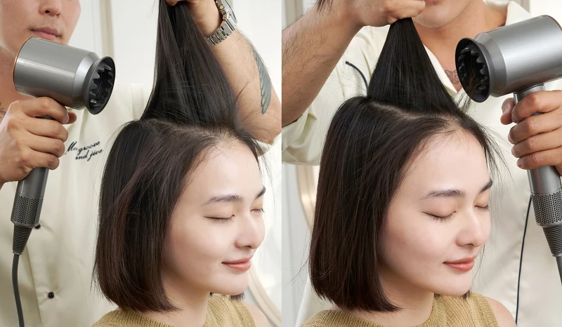 台灣天氣溼熱,女生多有扁塌髮的問題,黃一峯建議使用「柔和乾髮吹嘴」,特殊的設計在同樣的高速氣流之下降低了20%的溫度,能夠靠近髮根吹出蓬鬆感,將頭頂的髮束往上拉直並圍繞著髮根吹蓬(或拉直的髮根兩側),就算敏感頭皮也不擔心泛紅過乾,這招必學!皮膚科劉權毅醫師也提醒,要改善夏日出油出汗造成頭髮扁塌,除了平時吹髮的方式之外,也應該挑選正確洗髮產品、並且注意平時保養,健康的頭髮才能營造出蓬鬆感。