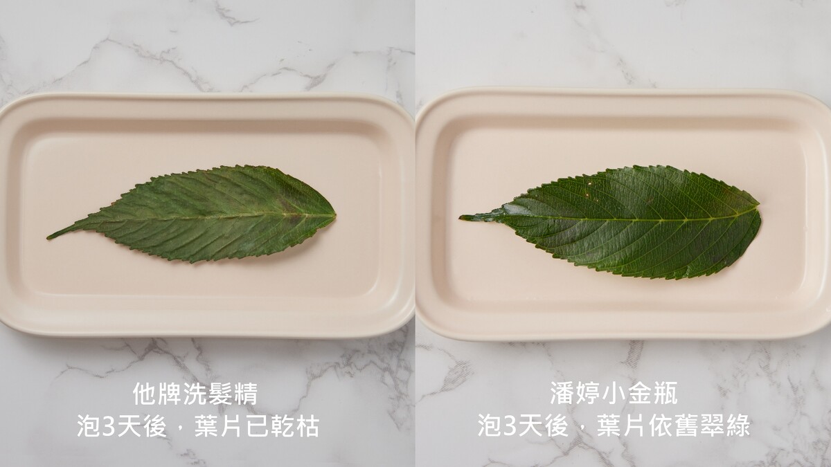 爆水小金瓶洗髮精+爆水膠囊真的不是洗一個寂寞而已,甚至拿起葉子馬上用平板夾也沒問題,葉片一樣不乾黃,看起來依舊鮮綠。他牌葉子本來已經乾枯,平板夾後又乾又黃。