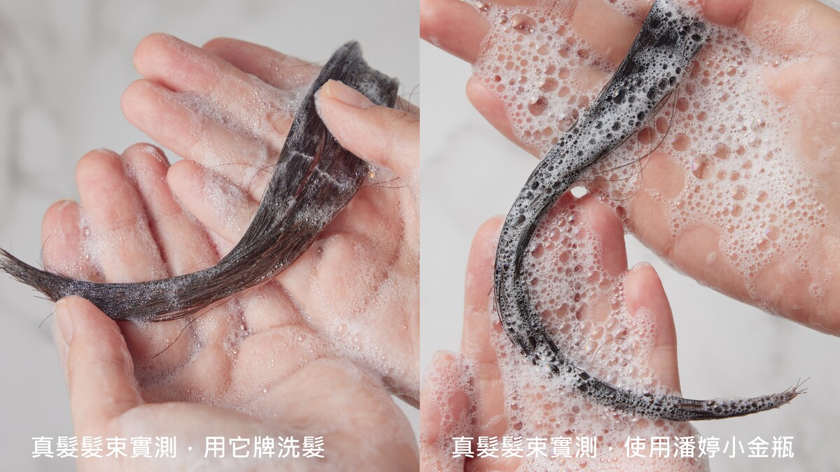 用真髮髮束來測試,分別使用爆水小金瓶洗髮精+爆水膠囊 VS. 他牌洗髮+護髮,兩髮束吹乾後再分別用高溫平板夾反覆夾10次後,立即見真章的修護補水效果,它牌炸毛到不堪入目,潘婷果然是神級保濕,秀髮水到不行!