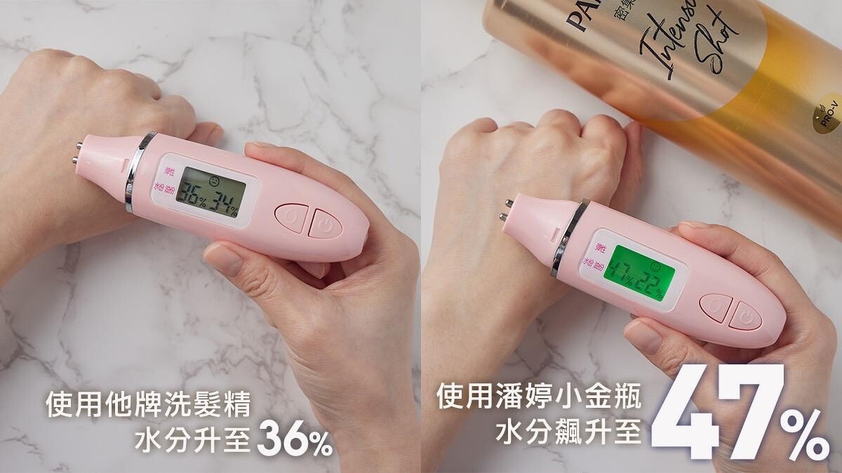 M編洗護前後做”頭皮保濕儀器實驗”,可以發現發現原本水分值只有26%的肌膚,在經過爆水小金瓶洗髮精+爆水膠囊與跟他牌洗髮+護髮分別清潔後,髮肌提升的保濕力差距超大!潘婷直接至飆升47%,它牌則是上升至36%,整整超越11%,可見爆水小金瓶洗髮精+爆水膠囊注水力超狂,連髮肌都爆水,髮蕊也無庸置疑超水潤!