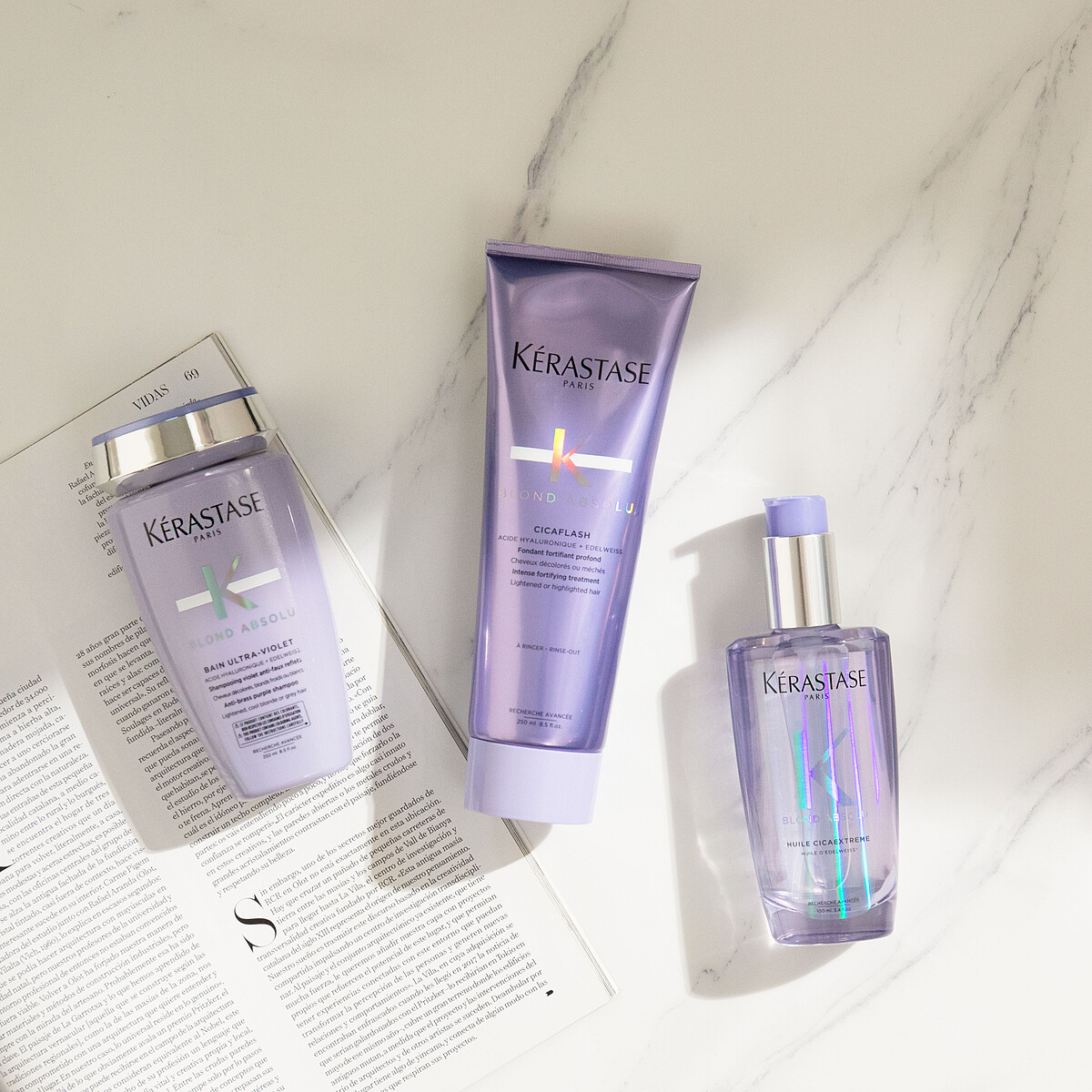 漂髮人的心酸就是傷害髮質程度根本直線飆高!造成頭髮脆弱易斷、粗糙無光!但冷色調的髮色又美到讓人無法放棄……M編護髮小祕訣就是將巴黎卡詩的恆彩重生與燦金絕色系列交替使用!燦金絕色系列添加玻尿酸與近年保養品超夯的雪絨花精萃成分,能迅速修補髮芯、深層補水,讓漂後乾枯秀髮枯木逢春,重現柔軟亮澤!搭配每週兩次的燦金絕色髮浴,紫羅蘭矯色粒子能去黃補色,維持冷色調髮色的時髦高光長達兩個月絕對OK!