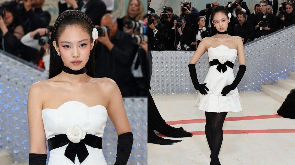 擁有「人間香奈兒」稱號的BLACKPINK Jennie亮麗登場,今年是Jennie首度出席Met Gala,以一襲香奈兒古董洋裝登場,俏皮中又帶優雅,腰間的山茶花讓造型更有份量。髮型上Jennie將髮絲編起後繞於頭頂,有點像是著韓服時的盤髮,不同的是後方髮絲並未盤起,披散的黑長髮優之餘也展現了年輕亮麗的氣息。