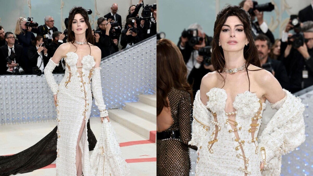 安海瑟薇則是重現Karl Larerfeld 1990年代繆思女神的形象以致敬老佛爺,以一襲Versace連身裙搭配Bulgari的硬幣項鍊。高顱頂綁髮加上公主頭讓造型更有氣勢,以鮮明的眼線妝容搭配裸色唇彩,展現九零年代的復古風格。