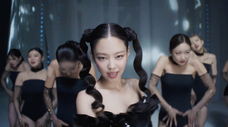 第二套雖然體感好像出現較少,但以黑色為主色,妝容上搭配了銀白色的大亮片點綴在眼下、眉骨閃閃發光,也和黑色的芭蕾感服飾上的亮片相呼應,是另一種高雅風格的搶眼。不過最引起我注意的非那緞帶感的雙馬尾莫屬,和第一個造型不同,長髮經過電棒整理,打造出像緞帶帶點扁平,又似纏繞般垂直的螺旋狀,隨著舞蹈動作飄逸,就算僅僅是在月光前的剪影也很吸睛,Jennie就像是真正的月光仙子一樣。