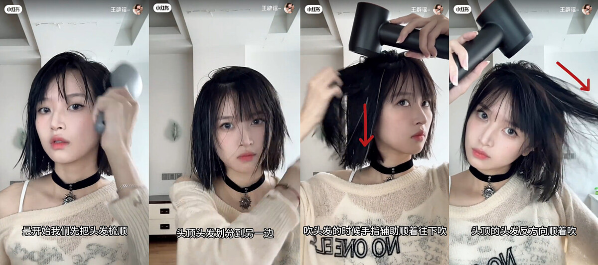 - 03. 吹髮時記得要用手指向下順著輔助,頭頂的頭髮則是分層往反方向吹乾髮根再翻回來。