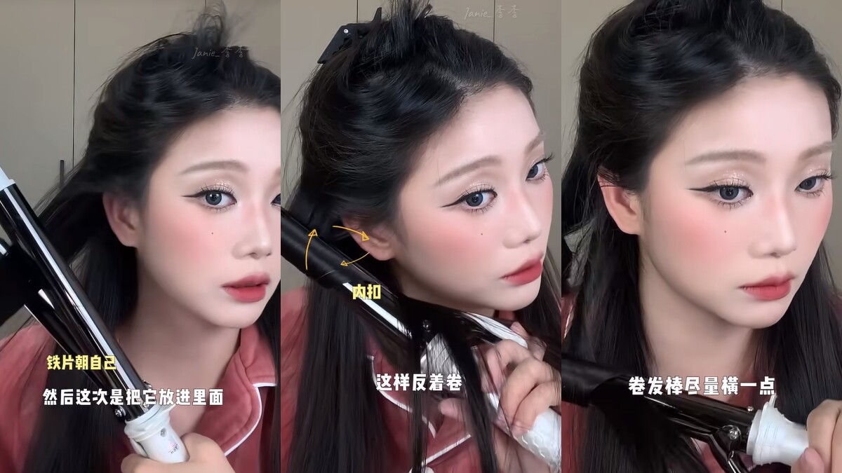 建議可以挑選中型的電棒,26-28mm左右,捲好後梳開的捲度會最剛好,電棒的夾片向內(朝向自己),平行的向內捲,稍作停留後繼續往下把整撮髮絲捲完,少量多次的卷完整頭。